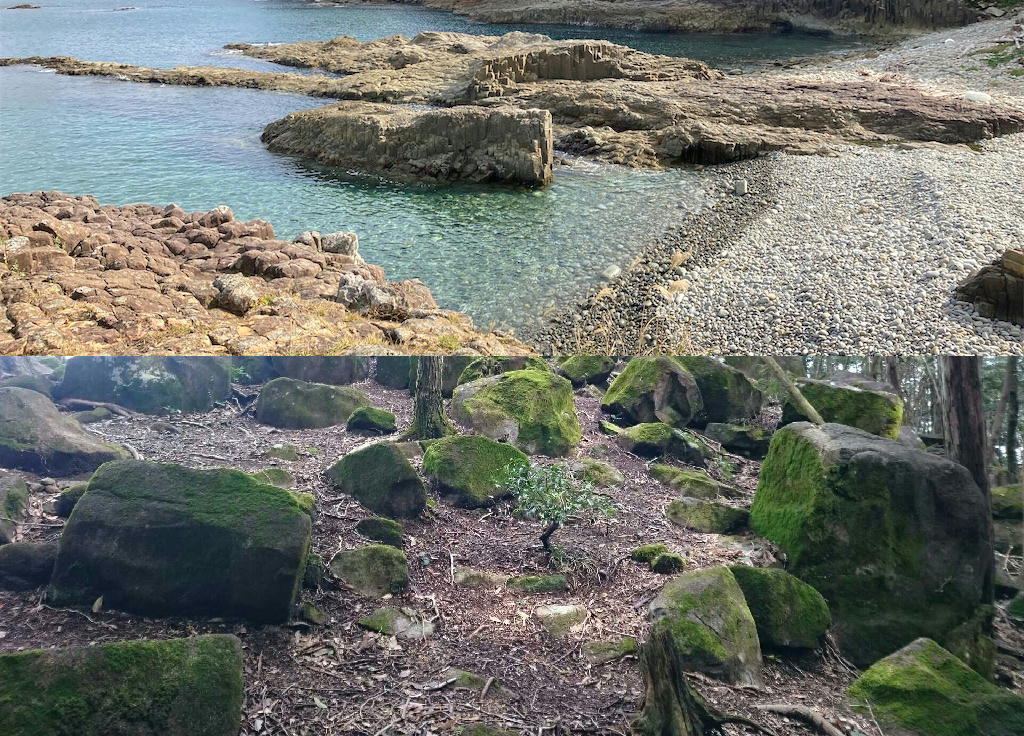 節理と節理の間に挟まれた小さな浜「カリマタベ」。一面に転がる楕円形の石は、もともと柱状節理だったものが節理に沿って割れた後、お互いぶつかって削れ、波に洗われて丸くなったものです。