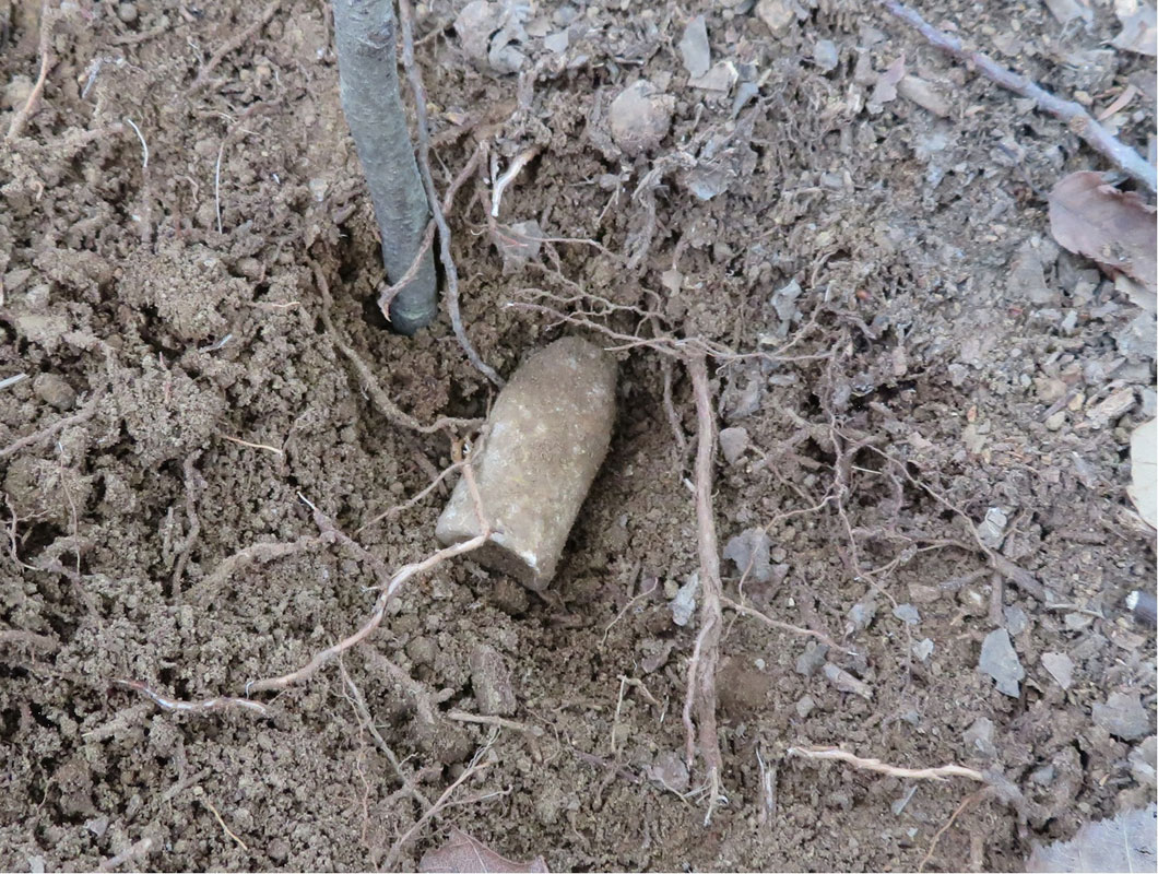 次に、耳川南岸の美々津町鹿場では、官軍の塹壕や石積みを確認しました。こちらでは、使用された薬莢(やっきょう)(弾を発射する火薬を詰めた容器)が見つかっています。また、馬の蹄に装着する蹄鉄が発見されました。当時の軍馬のものかはまだ確認がとれていませんが、大きさは現在の一般的なものよりもかなり小さく、小柄であった当時の馬のものである可能性が高いと考えています。