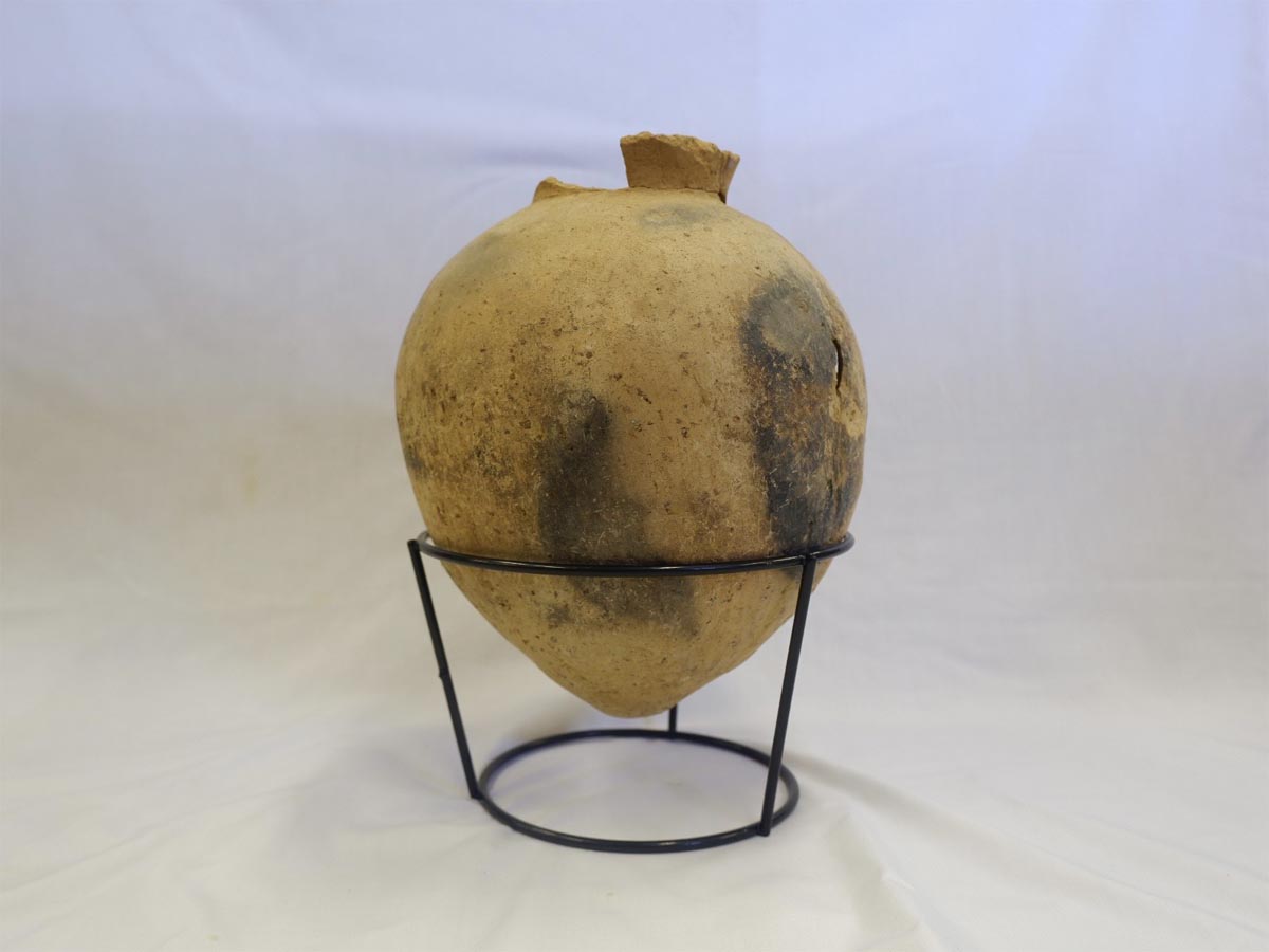 写真の土器は、昭和36(1988)年頃に東郷町越表の八ッ山地区から、圃場整備のときに出土した壺です。土器には、縄文土器、弥生土器、須恵器、土師器などの種類があり、煮炊きや貯蔵、盛り付けなどの用途や形状に応じて、壺、甕(かめ)、坏(つき)などさらに細かく分類されます。壺は食料の貯蔵に使用されたと考えられています。