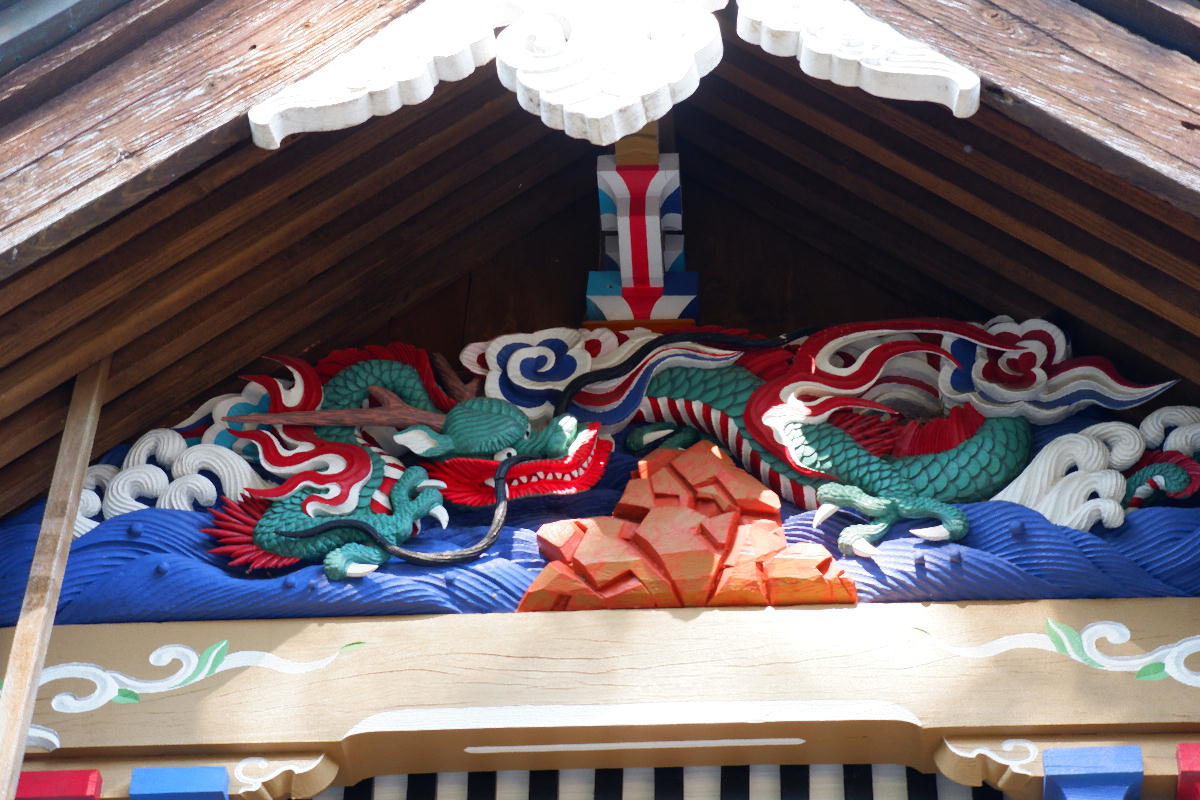 坪谷神社本殿には、付された彫刻だけでなく組物や懸魚にまで彩色が見られます。青を基調に、白や赤など様々な色を組み合わせて彩られ、水のような涼しさを感じさせてくれます。中でもひときわ目を引く彫刻は、荒れる波の上で緑に彩色された鉢を捻る妻飾りの龍ではないでしょうか。龍は深淵に潜み、空を飛翔して雨を呼ぶと言われる霊獣で、中国から伝わり、室町時代末期頃から寺社仏閣の彫刻として用いられ始めました。雨を呼ぶという龍の伝承は、雨乞いや火伏せへの祈りを体現していると言えるでしょう。