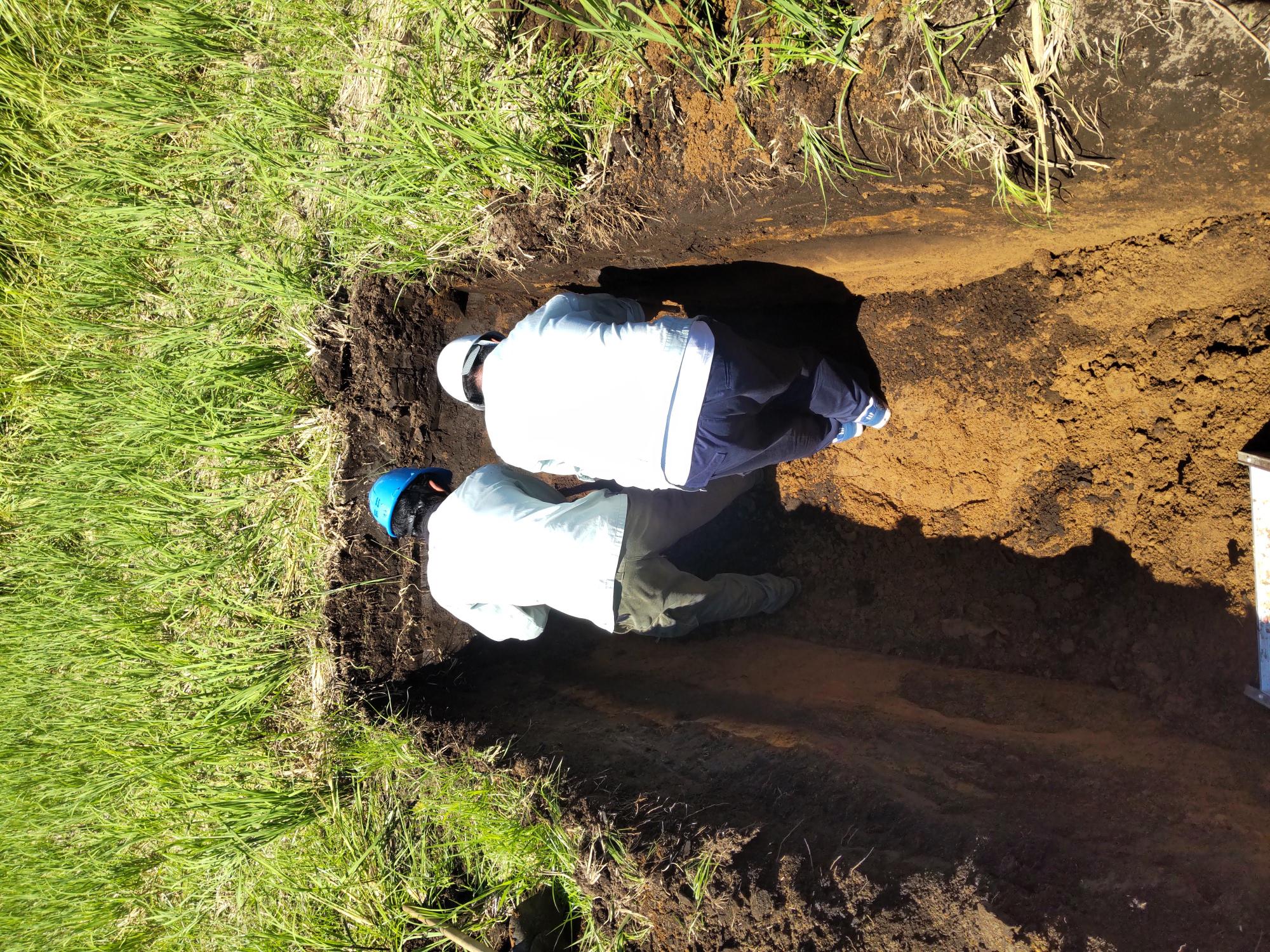 住宅建設や道路の敷設、その他開発行為などの工事を行うときには、該当地に遺跡がある場合があります(遺跡の有無は教育委員会で確認できます)。遺跡がある土地を工事する場合、まずは工事前に確認調査を実施します。工事予定地の一部に穴を掘り、その土地の土の重なりや、遺物(石器や土器などの生活に使用された道具)、遺構(建物の跡などの生活の痕跡)が残されていないかを確認します。主に土の色の変化や火山灰の有無を手掛かりに、慎重に調査を進めます。