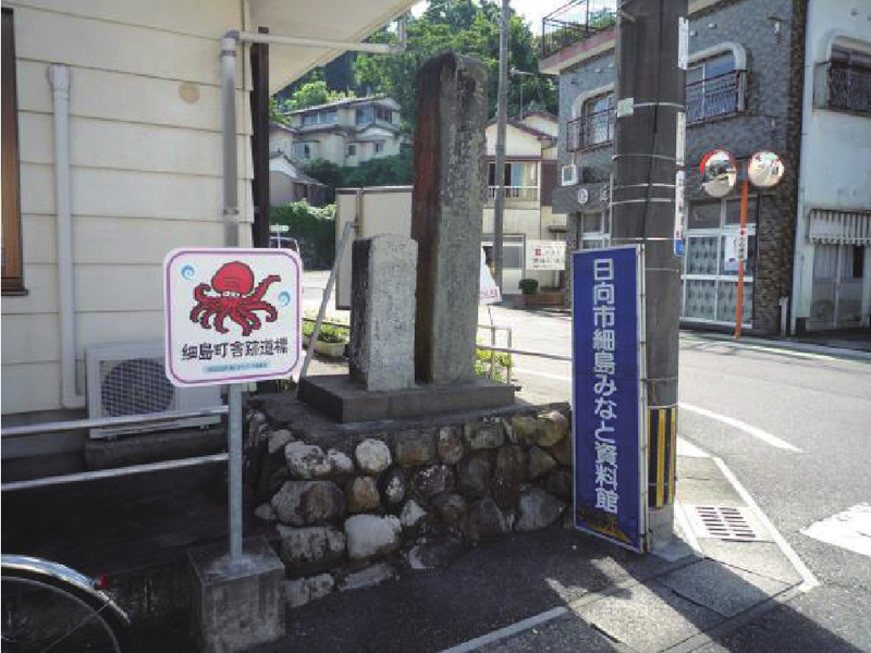 美々津地区の新町から石並に向って歩くと、海岸に通じる交差点があり、付近に高さ1メートルほどの石柱が建っています。この石柱は、明治35(1902)年に建てられたもので、宮崎ー大分ー都農ー富高までの距離が刻んであります。このような石柱は「道路元標」と呼ばれていますが、細島コミュニティセンター前にもあり、かつては交通の要所に必ず建てられていました。