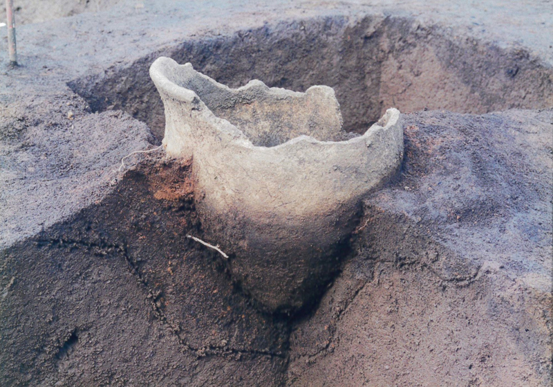さらに古墳時代では、竪穴式住居跡が検出されています。一辺が5メートルほどの方形のもので、柱の痕が3本確認でき中央部には炉跡と考えられる甕が埋められ、内部には焼土や炭化物が残っていました。こうした埋甕(うめがめ)の炉は、宮崎では6世紀後半に見られるもので、こちらも鶴野内にある中水流(なかずる)遺跡や広瀬田遺跡で検出されています。