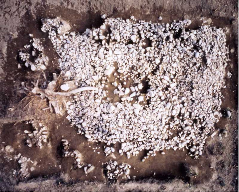 調査時、すでに社は失われていて御神木だけが神さまの存在を示していました。しかし埋土を取り除いていくと、社の基壇(きだん)を構成する礫群(れきぐん)が姿を現しました。基壇は約8×6メートルの長方形で、拳大(こぶしだい)から頭大の石が1メートルほどの高さに積み上げられていて、中央部には地鎮のための鎮壇具(ちんだんぐ)として唐津焼の甕が奉納されていました。鎮段具には宝物類などが納められるのが一般的です。しかし、ここでは扁平な小石が15個ほど入れられ、石の蓋がされていました。
